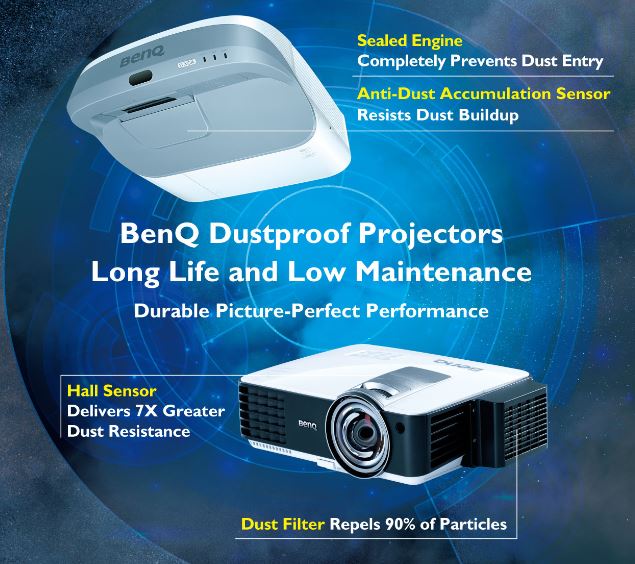 تعمل أجهزة العرض المضادة للغبار الخاصة بشركة بنكيو على دمج معزز (جهاز إضافي) واحد أو أكثر المصمم خصيصاً لإبعاد الغبار وتعزيز الأداء وإطالة أمد العمر التشغيلي للشاشة. وتوفر المحركات محكمة الغلق حماية كاملة لعجلة الألوان والشرائح المزودة بتقنية معالجة الضوء الرقمية (DLP) ومكونات مسار الضوء، وتعمل على القضاء عملياً على فكرة تعطيل أجهزة استشعار بعجلة الألوان والتركيز المرئي الدقيق على الصور واختفاء اللون. تكون المواد الجسيمية لفلاتر الغبار صغيرة الحجم مثل 2.5 ميكرومتر (2.5 مواد جسيمية) و90 في المائة من جميع جزيئات الغبار المحمولة جواً. وتعمل أجهزة الاستشعار الملحقة بالقاعة على جعل أجهزة العرض غير معرضة لتراكم الغبار. يعمل جهاز استشعار المضاد لتراكم الغبار والتابع لشركة بنكيو على منع تراكم الغبار، مما يؤدي إلى إطالة عمر الجهاز بشكل كبير.