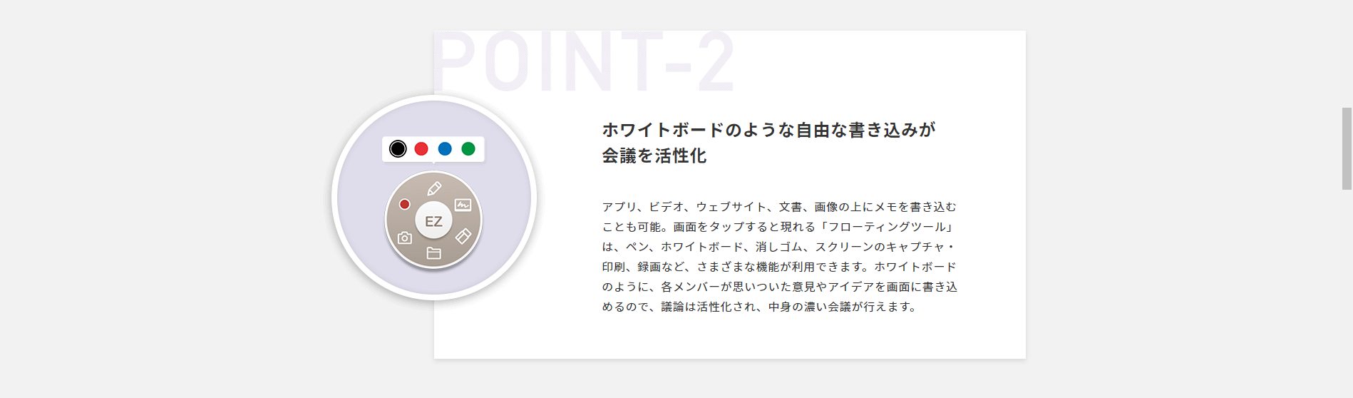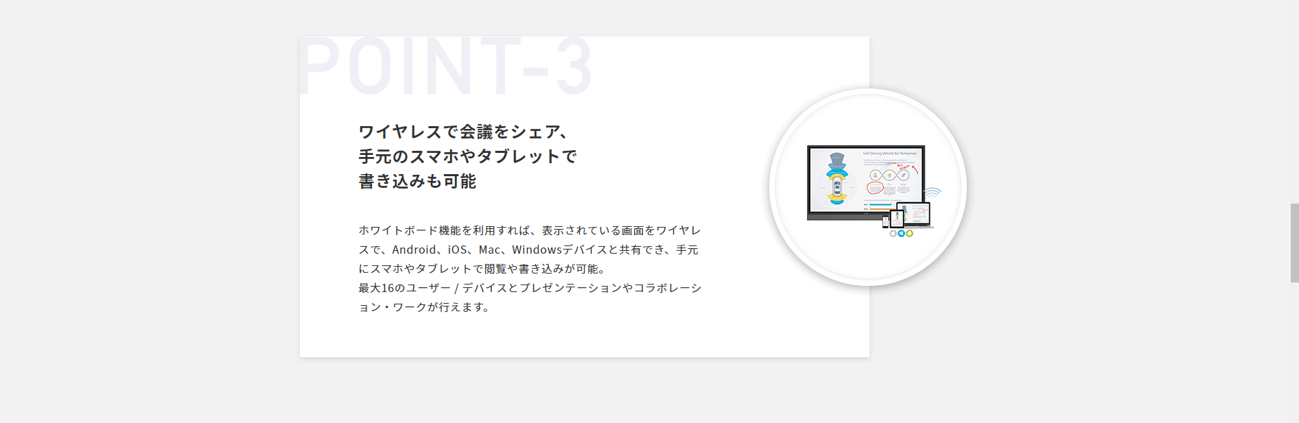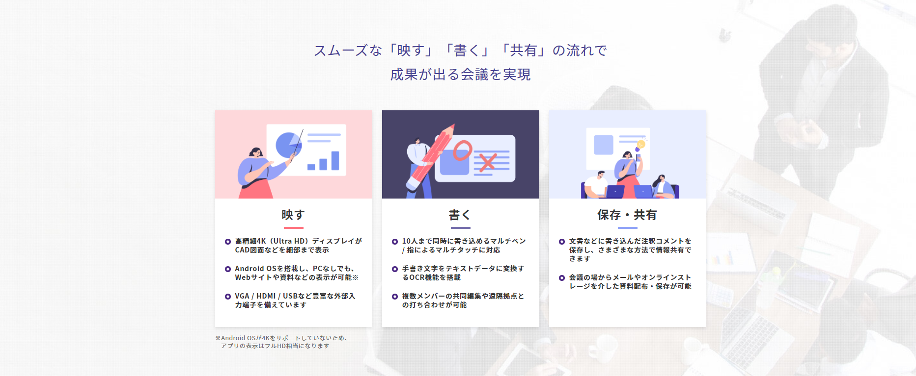 遠隔でのミーティングや授業を効率的に進める事ができます。資料や課題もそのまま共有でき、保存も可能です。ペーパレスも実現しコストカットにもつながります。