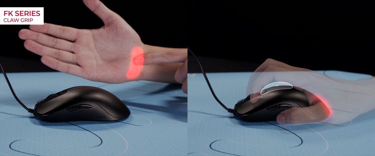 لمستخدمي القبضة المخلبية، ستكون نقطة التماس الوحيدة مع ماوس ’إف كى‘ هي الجزء الأدنى من راحة يدك وأصابعك مما يخلق مساحة فسيحة في الأعلى ويتيح تحريك الماوس تحريكًا أكثر مرونة. يتيح هذا التصميم العديد من الطرق لوضع أصابعك والاستقرار على قبضة مريحة.