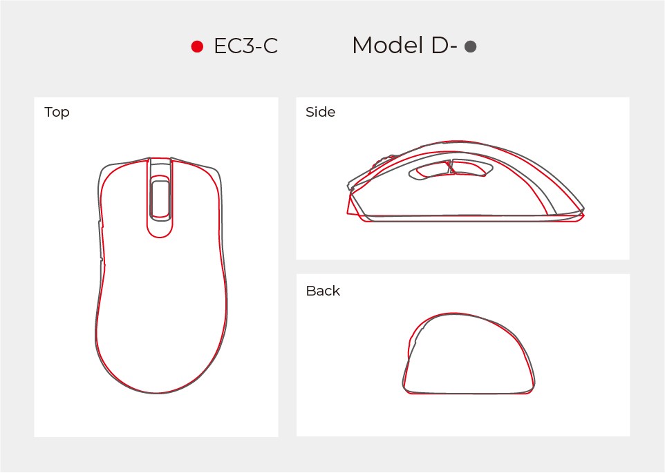 La prise en main est différente selon les préférences de chacun, comme la taille de la main, le style de prise en main et la façon dont vous jouez dans le jeu. Il est préférable d'évaluer la différence de prise en main de la EC3 par rapport à votre souris actuelle. Voici une comparaison entre l'EC3 et l'EC2 ainsi qu'avec des modèles d'autres marques pour que vous puissiez imiter votre sensation de prise en main et décider si l'EC3 est la bonne forme/taille pour vous.
