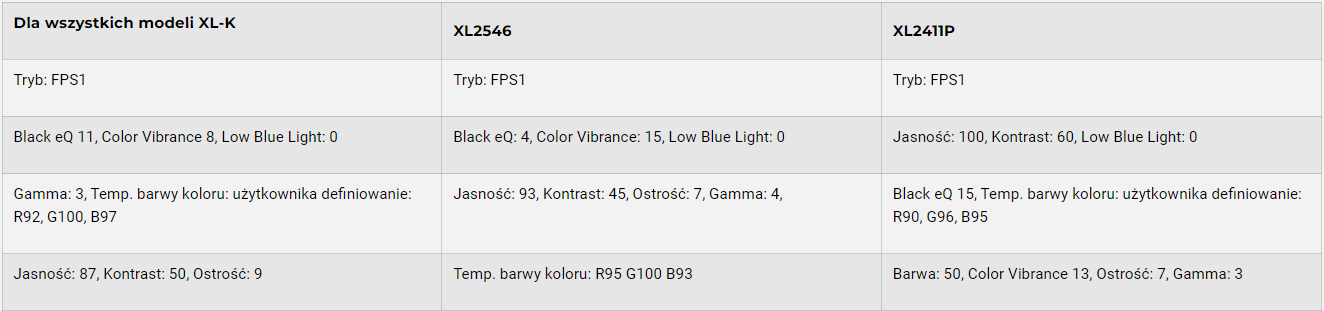 Załóżmy, że twój monitor XL nie obsługuje oprogramowania XL Setting to Share, lub chcesz ręcznie ustawić swój monitor XL-K. W takim przypadku możesz zapoznać się z poniższą tabelą i wprowadzić następujące parametry trybu CS2: