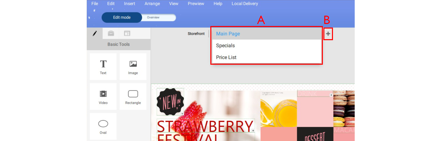 A. Pages Drop-down menu – Navigate to different pages by selecting the icon at the top of the canvas.