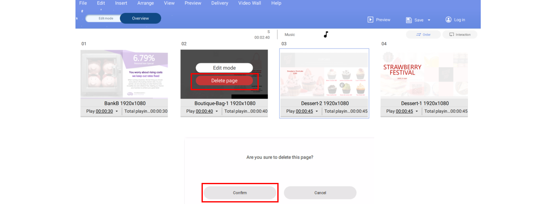 6. To delete pages, hover your cursor over the page icon and click Delete page. A warning message will appear, select Confirm to delete the page.