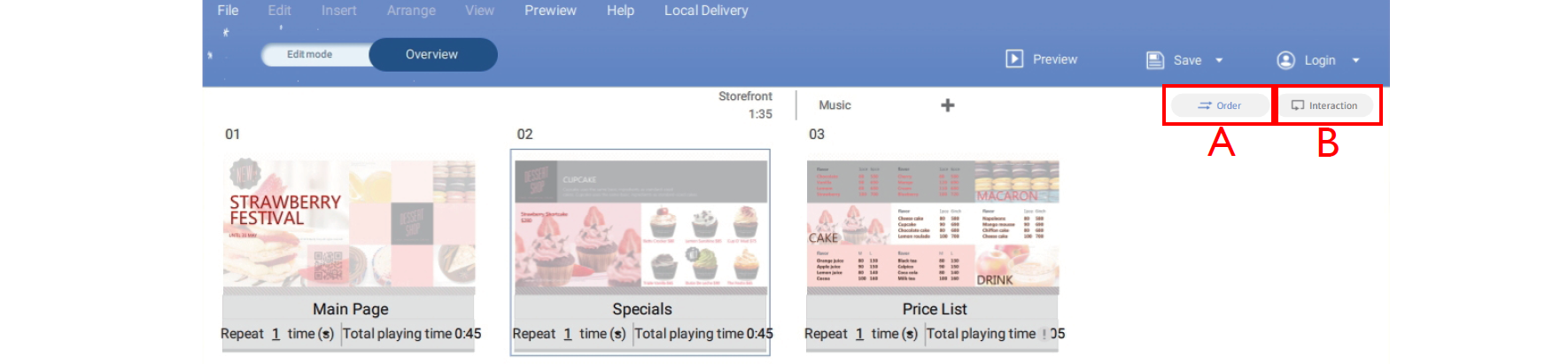 B. Interaction - To play a single page or selected pages in a continuous loop, click Interaction.