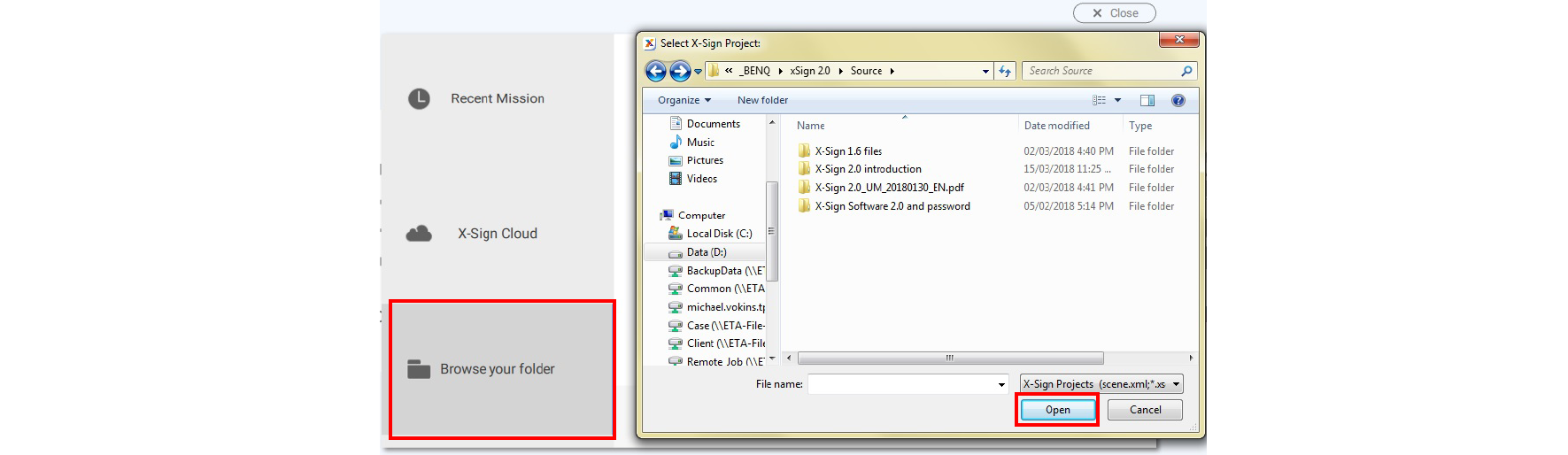 1. Launch the X-Sign Designer software and click Open Project (You can also select File > Open Project or Ctrl + O).