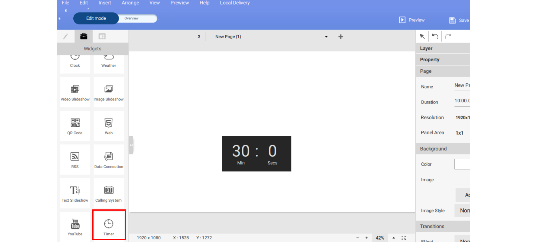 1. In X-Sign Designer, click on the icon to add a timer widget, and you will be prompted to place the timer widget.