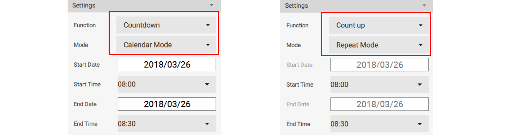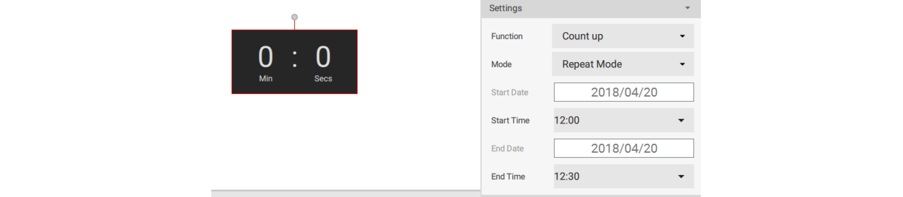 6. Countup shows the adding of time. It starts at 0:0 (minutes: seconds) and counts up to your scheduled end time. With Repeat Mode, the counting will occur everyday between the start and end time repeatedly.