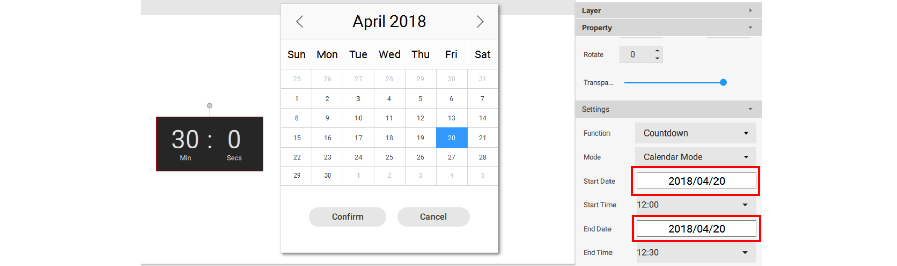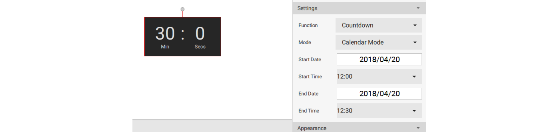3. You may set the properties of the timer widget in the editing area on the right panel. You can switch the count mode to Countdown and Count up. You can also switch mode to Calendar Mode and Repeat Mode.