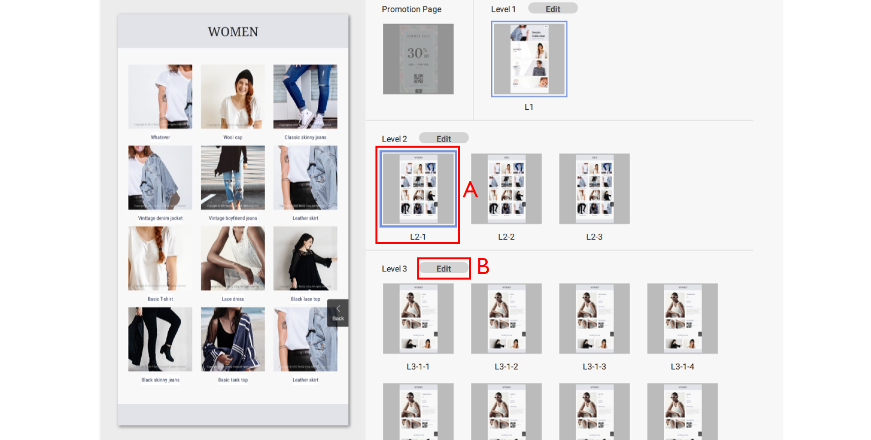 B. To edit a Template Page (which will affect the layout of your Content Pages), click the Edit button next to the Level you want to adjust.