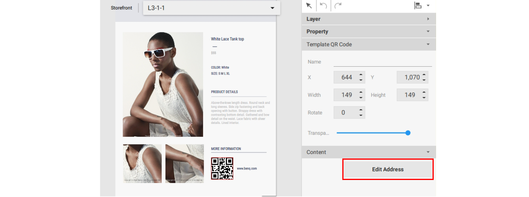 4. You can edit the URL for a QR code in a Content Page by selecting it in the canvas, then going to the Content panel on the right and clicking Edit Address. Enter the QR code link and click Confirm.