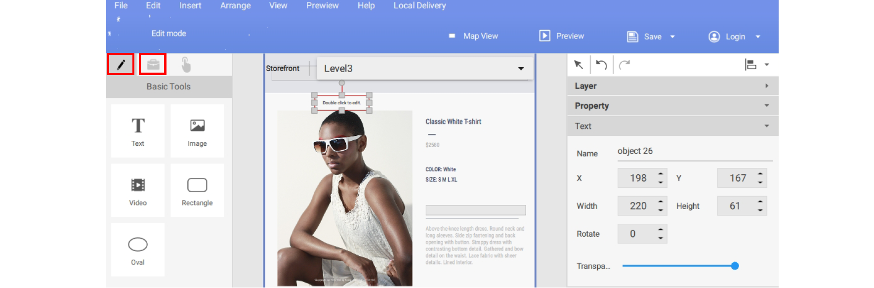 3. You can add new images, text or widgets to the Template Page by using either the Basic tool or Widget panel. Click the pen button to access the Basic tool panel or click the other icon to access the Widget panel. Refer to Creating content in X-Sign Designer for more information about using these tools.