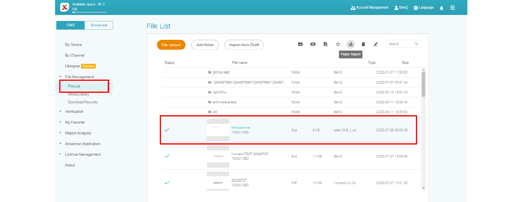 2. X-Sign records the playback history of each file on each device. Click Export, then the Player report is exported as an .xls or an .xlsx file type.