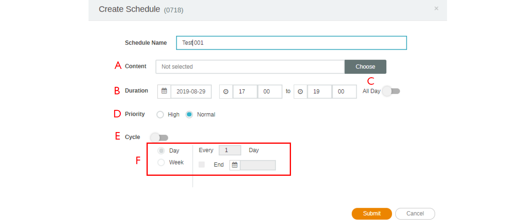 3. You will see the schedule setup window. Refer to Scheduling the content by channel for more information about A-F.